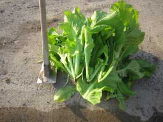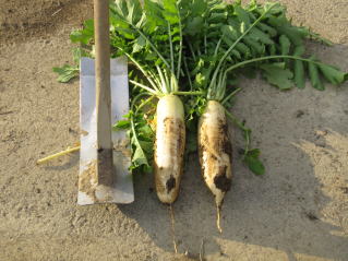 大根、青菜のお試し収穫をした。まだ少し早いようだ。