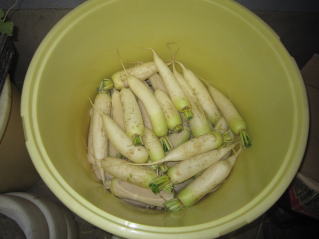 おらホの家庭菜園に降雪、タクアン漬け込み。