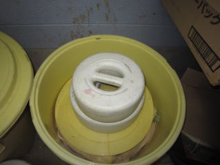 米糠に塩、タクアン付けの素を入れる。2024.12.08 10:34 干し大根を樽に置く。2024.12.08 10:40