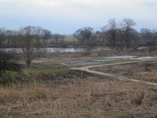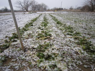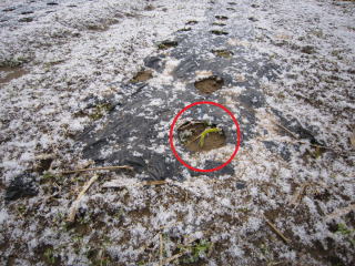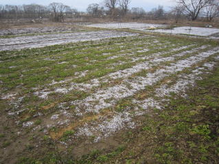 アッという間の雪どけ。雪どけが進Nだのでおらホの家庭菜園の下見をした。ニンニク、タマネギの越冬を確認した。