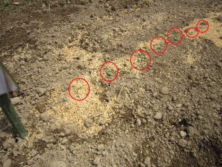 1週間前に棚蒔きした春まき大根の発芽を確認。