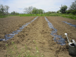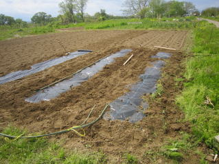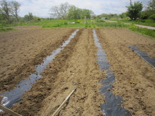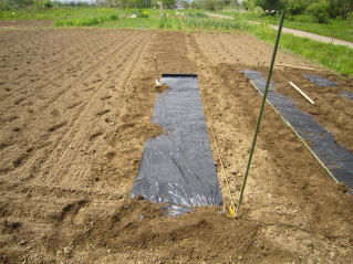 | マルチ張りは開始。左はキュウリ用。2025.05.05 9:55 | 二畝作業完了。2025.05.05 10:44 |