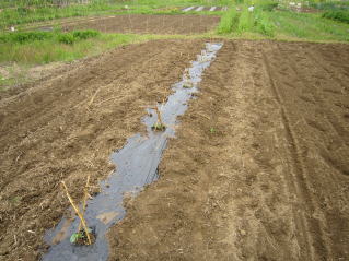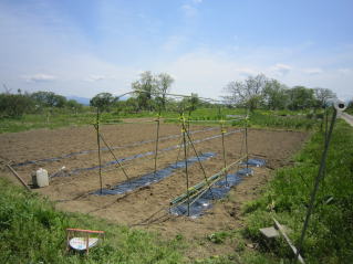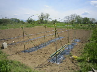 | キュウリマルチ張り完了。2025.05.05 9:55 | 支柱建て開始。2025.05.05 13:15 |