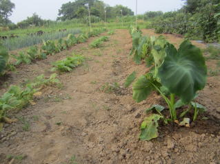 | 連術水かけをしている里芋。元気が良い。2025.07.09 5:16 | ナス、実をつけている。2025.07.09 5:16 |
