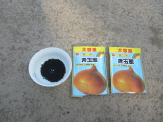 | 今年のタマネギの種。一番安価なも野を購入した。2025.08.17 6:24 | 三角鍬で溝を切り、均一に種をまく。厚くならないように注意しした。2025.08.17 6:39 |