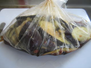 フリーザーパックにナスを入れ、醤油、刻みナンバンを入れ、冷蔵庫へ。1夜で食べられる。2025.08.20 7:19