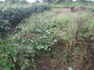気がかりだったサツマイモのツル返し。サツマイモ、久しぶりの雑草取りである。かなりの雑草、イモがネズミの被害にあっているかもしれない。