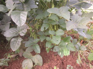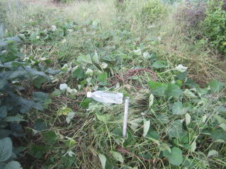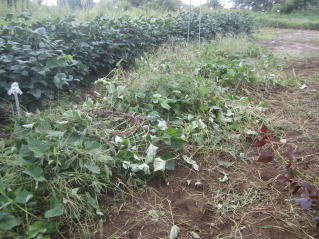 サツマイモツル返し兼ての雑草取り。初秋、おらホの百姓家庭菜園。秘伝豆の実、確認。