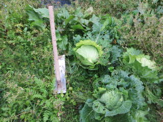 | キャベツ、大きくなって、玉になっている。2025.11.03 9:25 | キャベツ収穫。2025.11.03 9:30 |