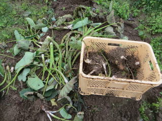 | 急に芋煮を食べたくなり、里芋の収穫をした。ついでに、ネギ、秋大根、ニンジン、キャベツの収穫。おらホの百姓、こんな時には重宝。 |