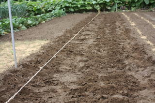 @良く耕した地面に深さ3センチメートル程度に、深さ約3センチの溝をV字状に掘ります。
