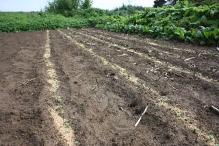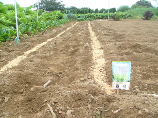 @良く耕した地面に深さ3センチメートル程度に、深さ約3センチの溝をV字状に掘ります。