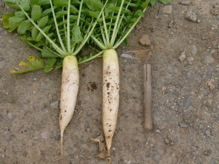 大根は秋11月に収穫します。このころになると太さ7〜8センチ、長さ50センチ程度に成長しています。