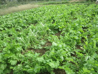 間引き待つ秋大根、青菜。2023.10.08 13:47 秋大根間引き完了。2023.10.08 14:28