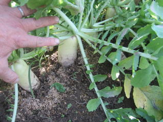 青首大根は煮物に利用し食べきれないので屋敷畑内に埋め保存します。食べる時雪の名から掘り起こします