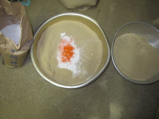 @米糠に塩を入れかき回す。Aこれに市販のタクアン付けの素を入れ更にかき回す。2023.11.29 16:54 大樽に干し大根を入れ、Aを交互にかける。2023.11.29 17:13