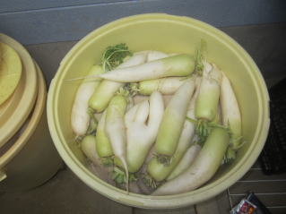 秋大根収穫期。2023.11.18 7:28 タクアン漬け用に洗い大根。全腕40本。203.11..19  15:58