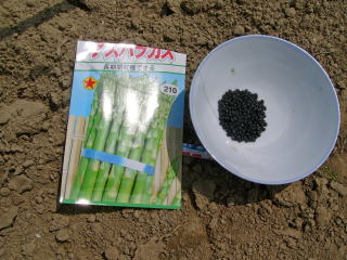 スジ蒔き風に一粒ずつアスパラガス種蒔きました。