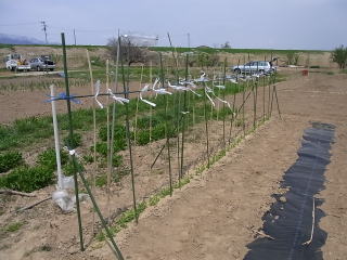 6センチ位になっら支柱を立てます。私は写真のような立て方をしています。材料は近くに自生している枯れたヨシと市販されているイボ竹を適宜利用しています。