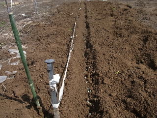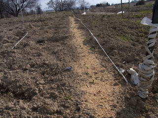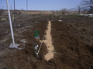 @良く耕した地面に鍬等で約5センチメートルのV字の溝を作ります。5センチはあくまでも経験上です。種が土から出ないようにしています。