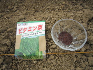 Aここにパラパラと筋まきふうに蒔いていきます。春菊のような種なので蒔きやすいです。
