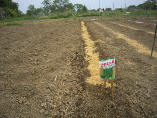 @良く耕した地面に深さ3〜4センチメートルの溝を掘ります。