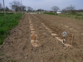 @良く耕した地面に15センチ間隔に直径15センチ、深さ数センチ程度の窪みを掘ります。この時底を出来るだけ平にします。