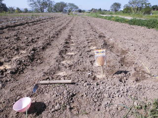 @良く耕した地面に15センチ間隔に直径15センチ、深さ数センチ程度の窪みを掘ります。この時底を出来るだけ平にします。
