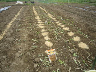 @良く耕した地面に15センチ間隔に直径15センチ、深さ数センチ程度の窪みを掘ります。この時底を出来るだけ平にします。