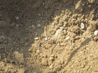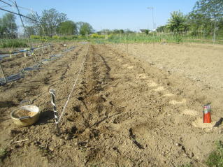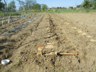 @良く耕した地面に15センチ間隔に直径15センチ、深さ数センチ程度の窪みを掘ります。この時底を出来るだけ平にします。