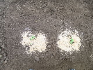 周りに籾殻を蒔き、殺虫剤(オルトラン)を蒔いて作業完了です