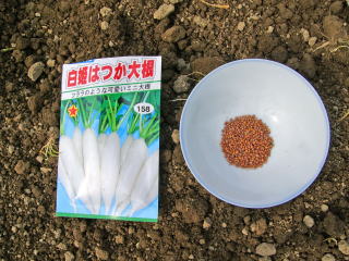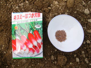 種袋の後ろを見ると蒔き時というのはないようだが、6月以降になると他の美味しい野菜が取れ始めるので「野菜に飢えている時期」に限定して栽培している。夏蒔きするとアッと言う間に「お化けミニ大根」になるので気を許せない。