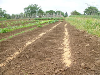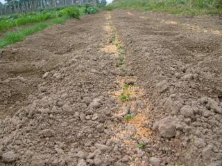 @良く耕した地面に深さ3センチメートル程度に、深さ約3センチの溝をV字状に掘ります。