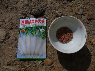 種袋の後ろを見ると蒔き時というのはないようだが、6月以降になると他の美味しい野菜が取れ始めるので「野菜に飢えている時期」に限定して栽培している。夏蒔きするとアッと言う間に「お化けミニ大根」になるので気を許せない。