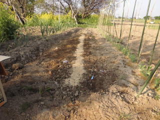 @良く耕した地面に深さ3センチメートル程度に、深さ約3センチの溝をV字状に掘ります。