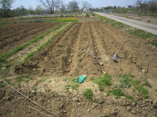 三角鍬で深さ約10センチの溝を切り芋を仮置き染ます。種芋は男爵イモ。昨年SY痛覚四の食べ残りです。1畝に約30個。計120個苅り子期しました。