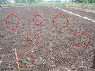 地面を割るように濃い緑色の販の芽がボッと出てきます。例年、植付けしてから7〜10日間で発芽しています。