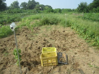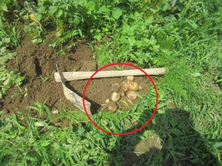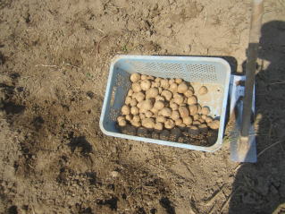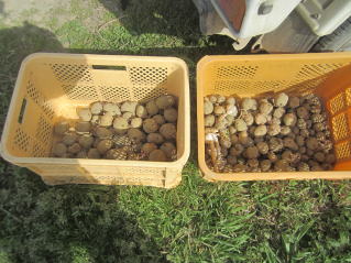 茎が枯れた頃を見計らって発掘します。どこに埋まっているか分かりませんので遠目から桑を入れていきます。収穫は楽しいですが結構重労働です。