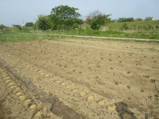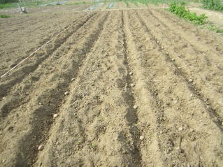 Bこの溝に約45pおきに芽が上向きになるように種芋を置いていきます。この時まだ土をかけません。