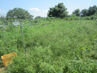 雑草だらけのジャガイモ箇所。厳しい。2023.07.23 13:05 雑草取り兼ねてのジャガイモ収穫。2023.07.23 14:22
