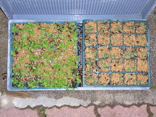 今年もキャベツ芽だししてくれました。キャベツは右側です。