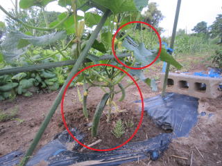 C風で倒れないように支柱を当てます。(おらホでは周りにあるヨシを適当な長さに切って利用していますが、細めの市販のイボ竹を使ってもよいでしょう。)ある程度大きくなったらイボ竹を支柱とします。