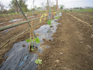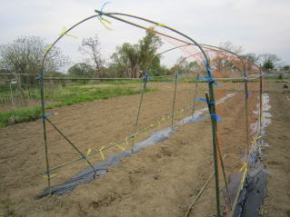 @よく耕した地面に幅3〜4尺のマルチ(黒い農業用ビニール)を敷き、固定します。マルチの敷き方にはコツがありますが、おらホでは風のない早朝にしています。