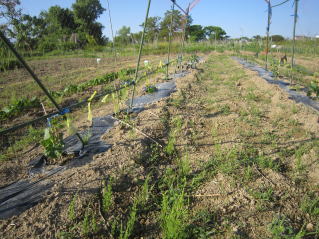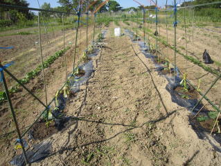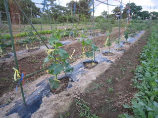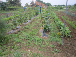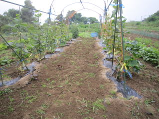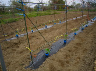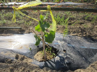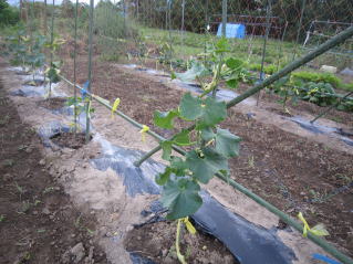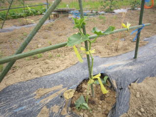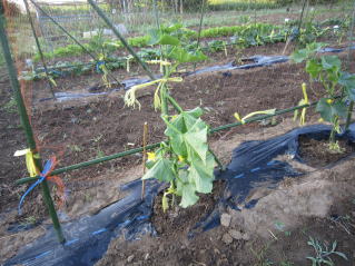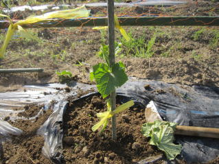 おらホでは4月末からホームセンター店頭にナス、キュウリ等ともに苗が並び始めます。これを買い求めて5月1日前後に定植しています。おらホでは洪水被害のリスクがあるので、接ぎ木でない安価なもの「70円」程度を20本ほど購入しております。