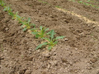 @3センチメートル位の若芽になったとき芽から15センチ位の所に顆粒状合成肥料をパラパラッと蒔き、軽く土を寄せます。