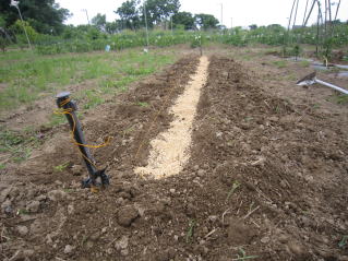 @良く耕した地面に深さ3センチメートル程度に、V字状に溝を掘ります。