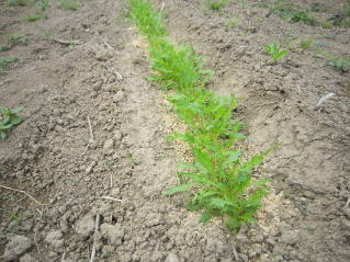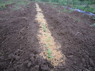 @3センチメートル位の若芽になったとき芽から15センチ位の所に顆粒状合成肥料をパラパラッと蒔き、軽く土を寄せます。
