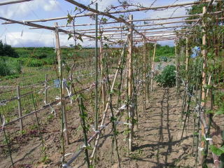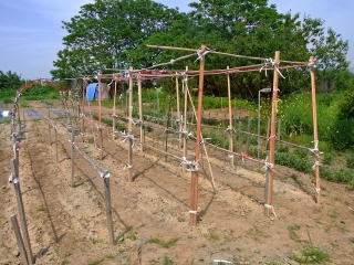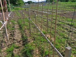 芽が出たらイボ竹を刺して支柱横棒に固定していきます。こうす