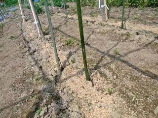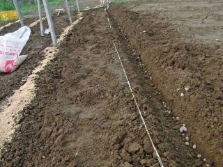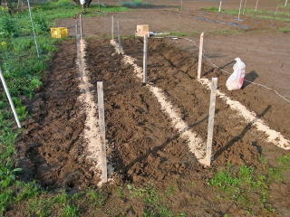 土をかけ籾殻を蒔きました。畝幅は60センチ程度です。杭は