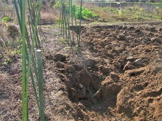 @深さ15センチの溝を掘り、約30センチ間隔で横置きし土をかけました。